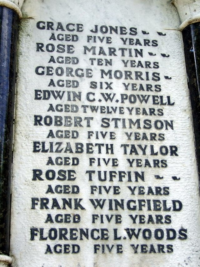 War Memorial to children killed by German bombs which fell on Upper North Street School, Poplar, London, 1917. This shows the typical simple names for children favoured by most families in the late nineteenth and early twentieth centuries. Via Wikimedia Commons.
