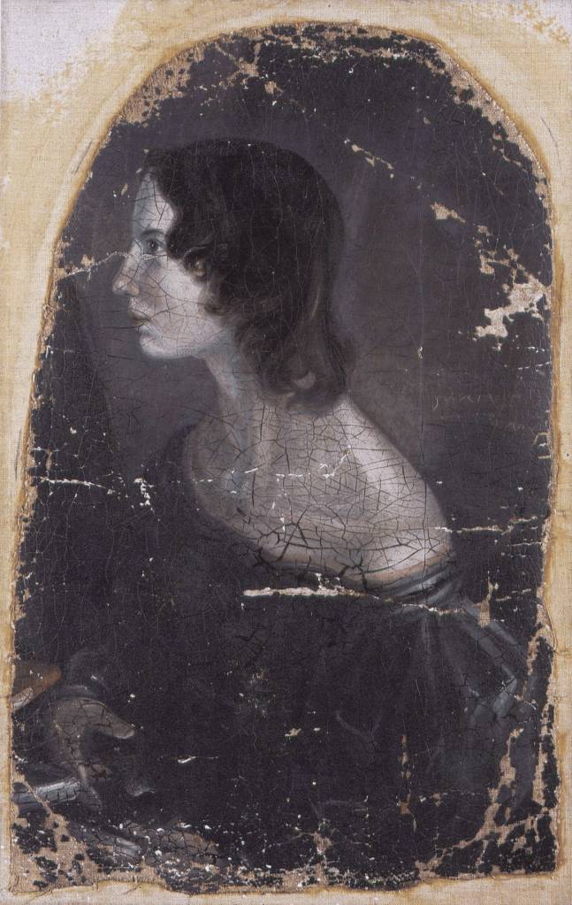 Luckily for us, whilst the Bronte sisters would not, normally-speaking, have been candidates for portraiture during their lifetimes, they happened to have a painter in the family in the shape of their brother Branwell. Our main knowledge of Emily’s appearance comes from his portrait of all three sisters painted in 1833. Here the sister most generally taken to be Emily is a tall languid-eyed woman with a rather prim face surrounded by auburn curls. But Branwell’s portraits were notoriously inaccurate and when, after their deaths, Arthur Bell Nicholls, Charlotte’s husband, was asked which sister was which in the portrait he couldn’t be sure. There is a second portrait of just one of the sisters (a fragment also kept in the National Portrait Gallery). The sitter was identified by the long-term friend of the Brontes, Ellen Nussey, in the 1870s as AB (Anne Bronte). It has more recently, however, been described as Emily.